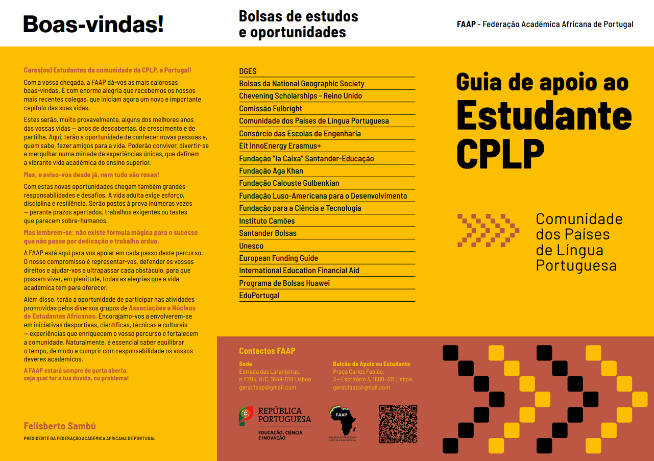 Produzido pela Federação Académica Africana de Portugal (FAAP), o guia reúne informação prática e atualizada sobre chegada e acolhimento, matrícula e documentação, AIMA e título de residência, acesso à saúde, finanças, alojamento, transportes, vida académica, integração e bolsas de estudo.