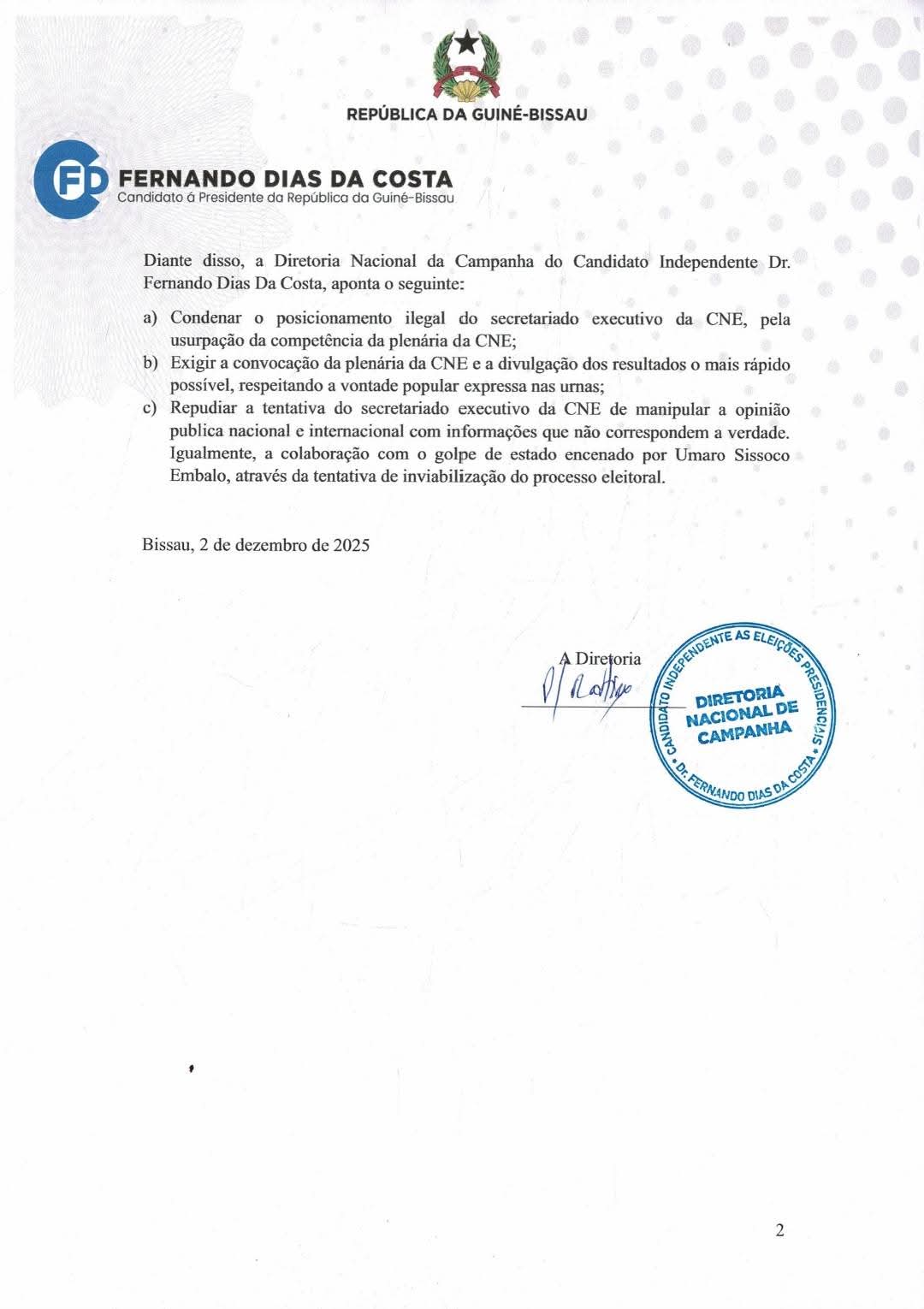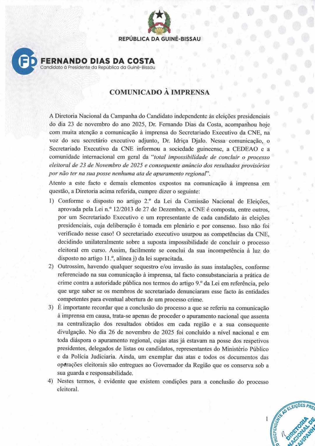 A Diretoria Nacional da campanha de Fernando Dias da Costa garante que existem condições para concluir o processo eleitoral na Guiné-Bissau.